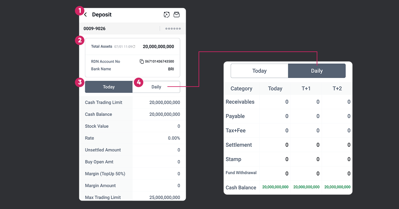 Deposit adalah fitur yang digunakan nasabah untuk melihat informasi dana yang tersedia di rekening efek serta melakukan transfer dana masuk untuk keperluan transaksi saham.