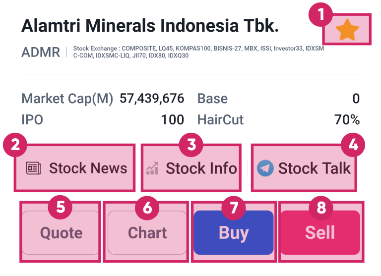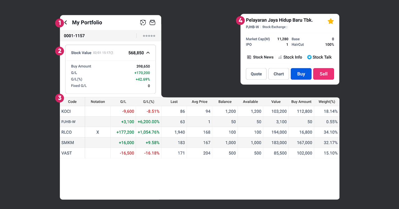 Tap pada salah satu saham akan membuka Popup Detail Saham (Label 4).