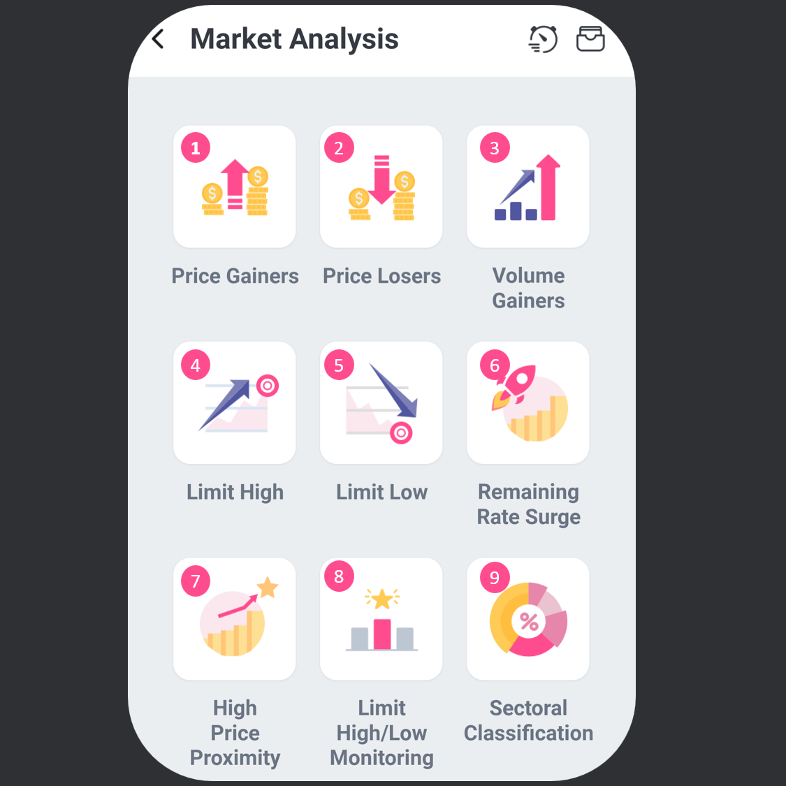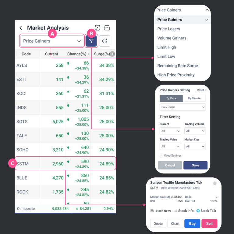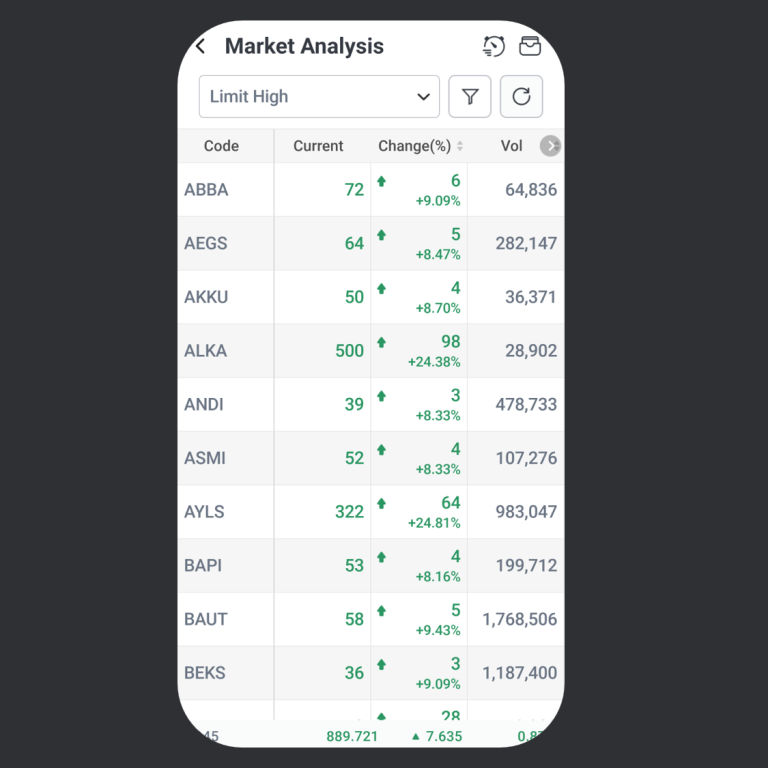 Menu Market Analysis berfungsi untuk melihat dan memantau pergerakan saham berdasarkan harga, volume, limit, dan sektor secara cepat.