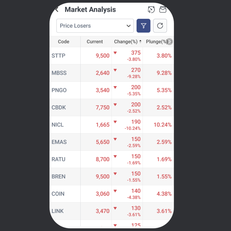 Price Losers membantu pengguna melihat saham yang sedang mengalami penurunan harga.