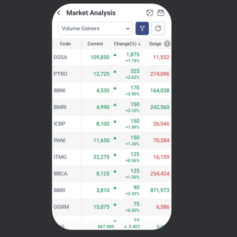 anda dapat mengurutkan saham berdasarkan Change (%) atau Surge (%) dengan double klik pada judul kolom. Klik tombol (›) untuk melihat urutan saham berikutnya. Fitur ini berlaku untuk semua kategori Market Analysis.