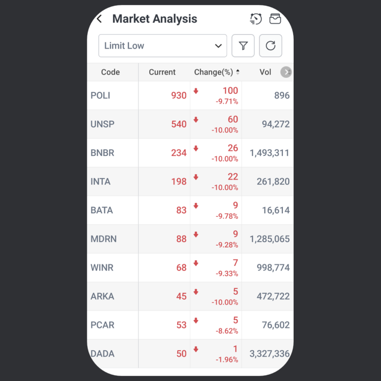 Fitur Limit Low membantu pengguna mengetahui saham yang turun paling dalam hingga batas hariannya, sehingga pengguna bisa lebih waspada sebelum bertransaksi.