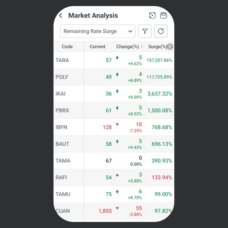 Feature Remaining Rate Surge menampilkan saham yang masih memiliki sisa potensi kenaikan harga sebelum mencapai batas kenaikan harian. Fitur ini membantu pengguna melihat saham yang masih berpeluang naik lebih lanjut.