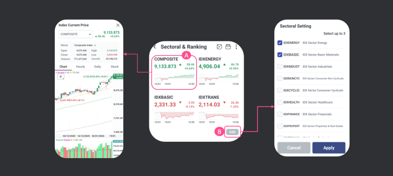 Layar Sectoral & Ranking ini berfungsi untuk memantau kinerja pasar saham secara ringkas dan real-time, dengan fokus pada indeks sektor, News Update & peringkat saham.