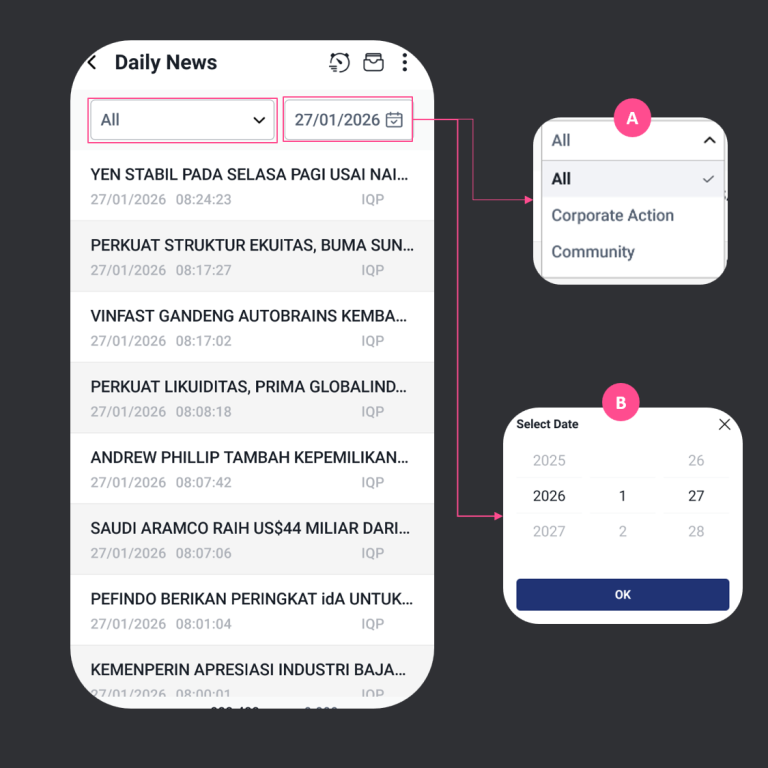 - Dropdown “All” digunakan untuk menyaring berita berdasarkan kategori All, Corporate Action atau Community.