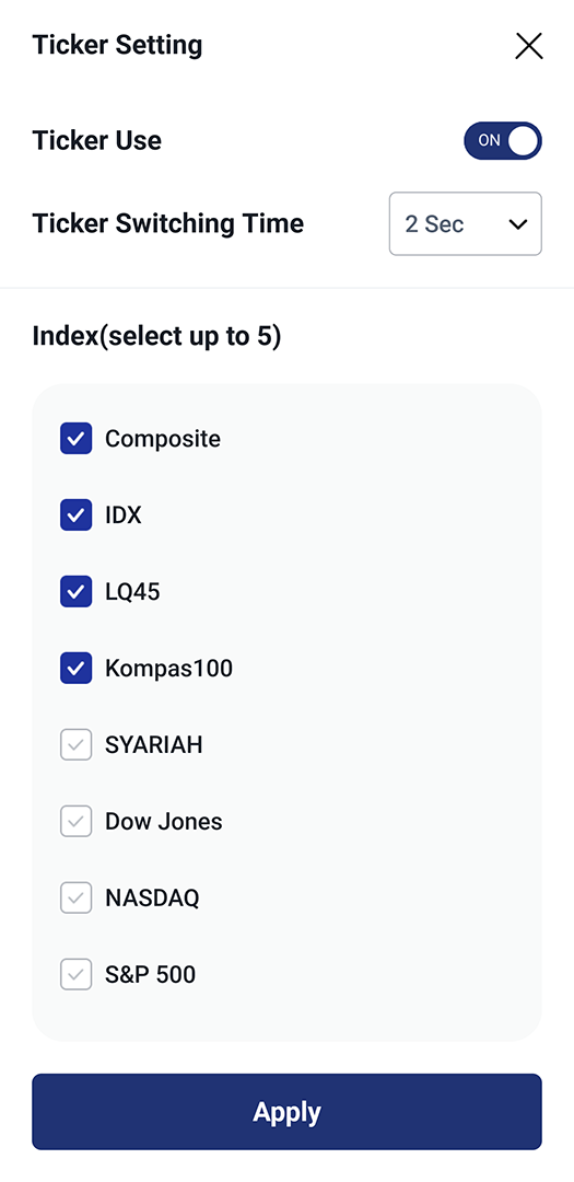 Anda dapat mengatur tampilan ticker dengan meng-klik icon gear pada pojok kanan atas.