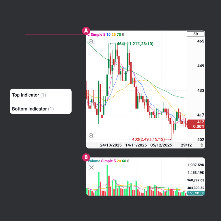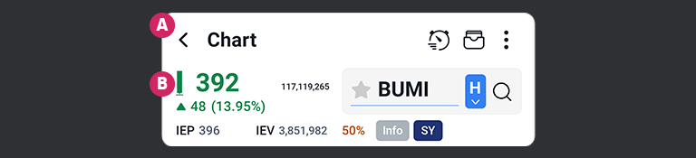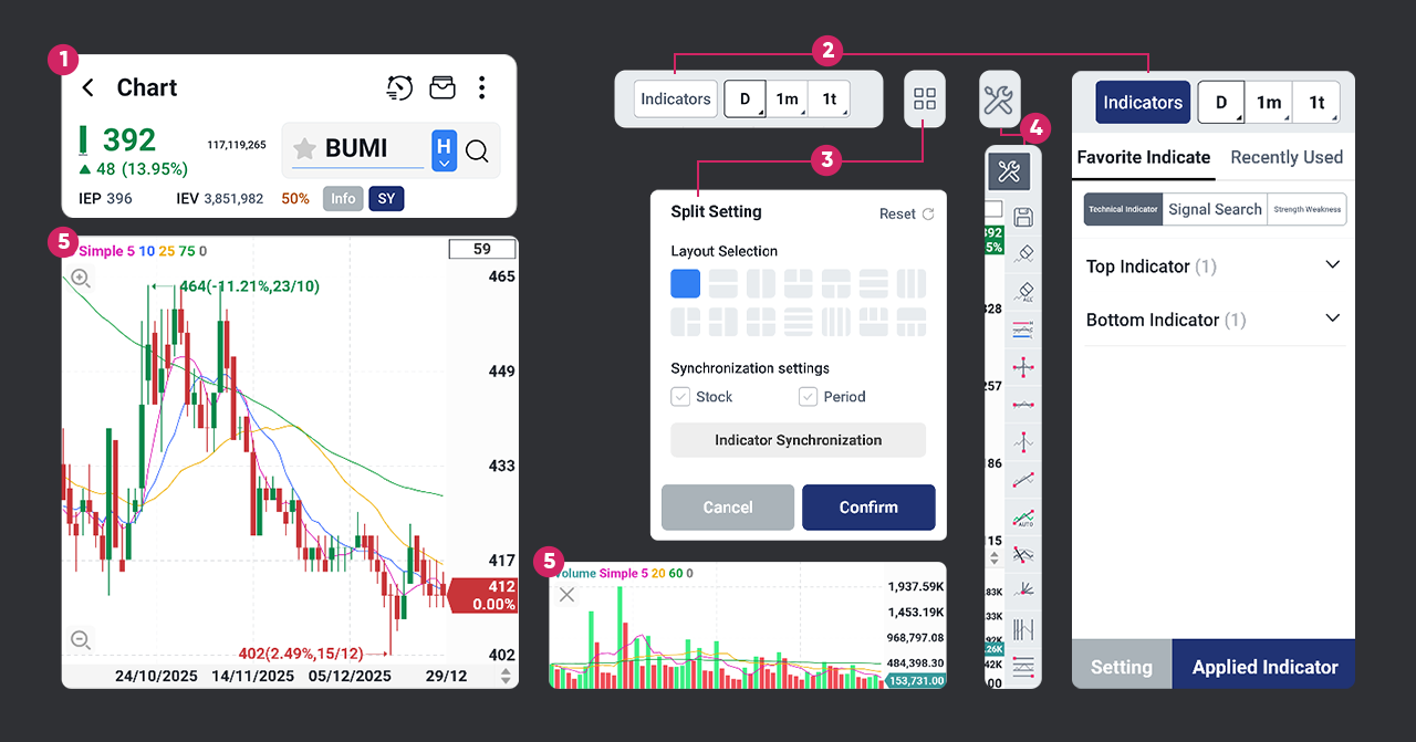 Chart adalah fitur utama untuk menganalisis pergerakan harga saham secara visual menggunakan grafik, indikator teknikal, sinyal, dan alat gambar.