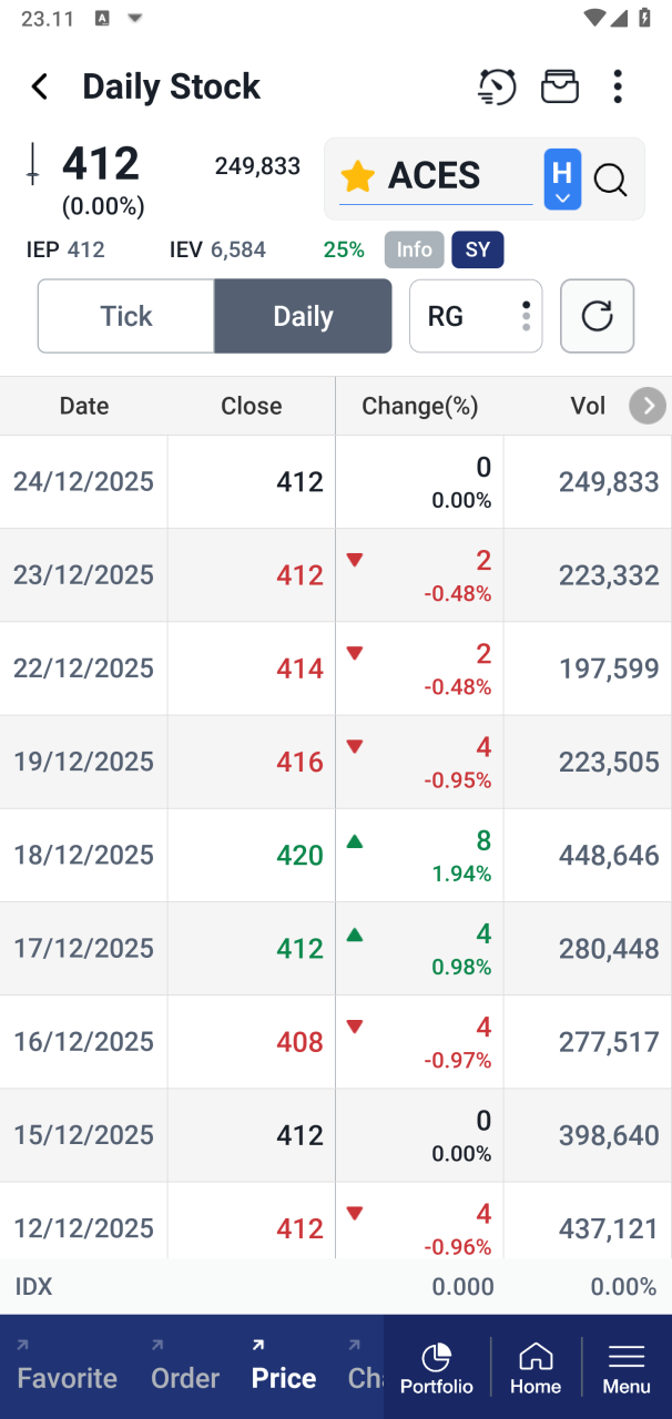 Daily Stock adalah halaman yang menampilkan riwayat harga saham berdasarkan hasil transaksi (match), baik untuk hari berjalan maupun hari-hari sebelumnya.