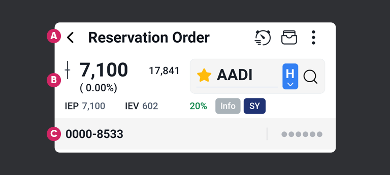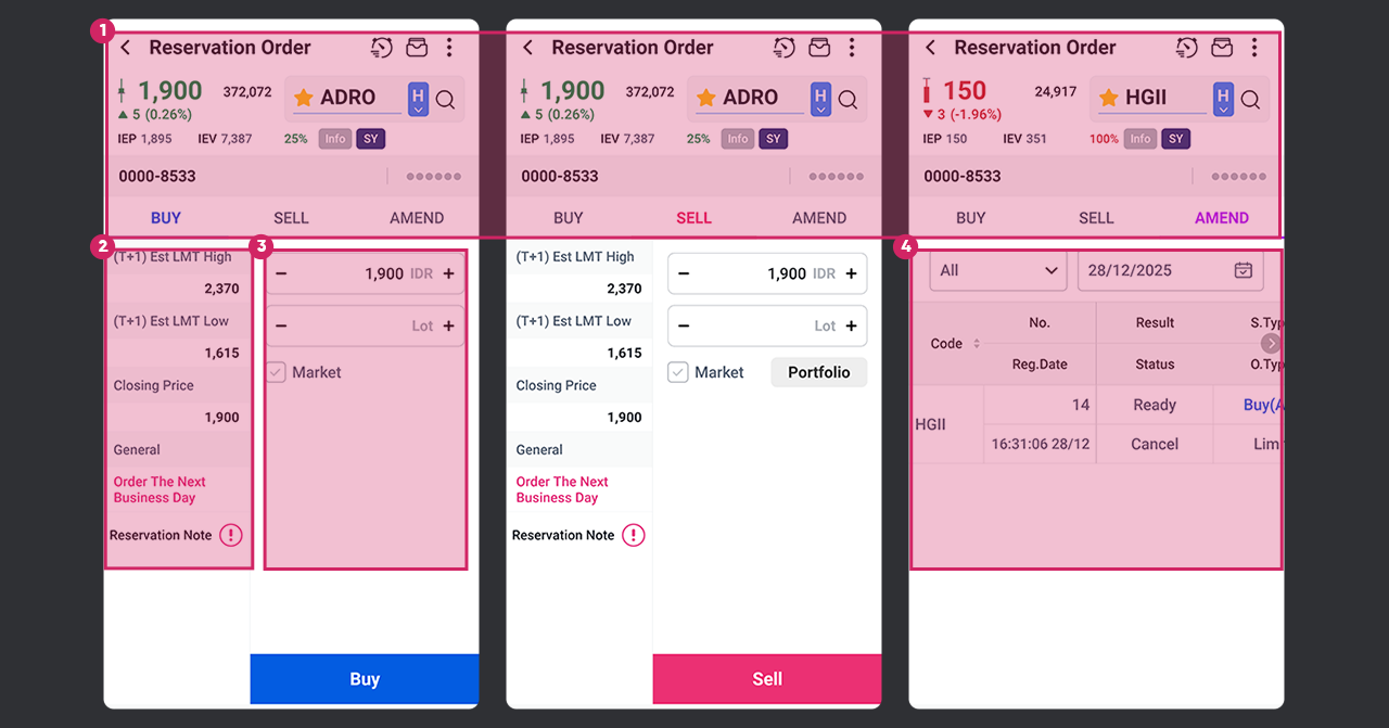 Reservation Order adalah fitur dimana user dapat membuat orderan satu hari sebelumnya. layar ini hanya dapat digunakan pada saat diluar jam perdagangan (Maksimal input order hingga jam 7:00 AM) dan akan di kirim kebursa setiap pagi harinya sekitar pukul 8:45 AM pagi pada sesi pre-opening (Masuk pada layar stock order). Orderan yang di buat melalui layar ini hanya berlaku untuk 1 hari dan tidak akan dijalankan kembali apabila tidak match pada hari ini.