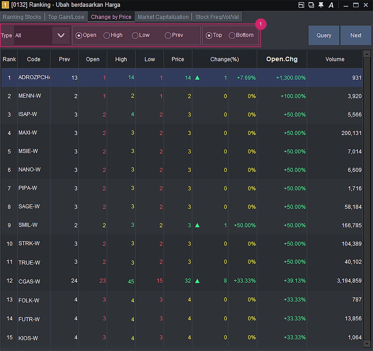 Anda dapat memilih Jenis Saham dengan mengklik Button ⚪, Jenis Harga (Open, High, Low dan Previous) serta penawaran Jual tertinggi dan penawaran beli terendah