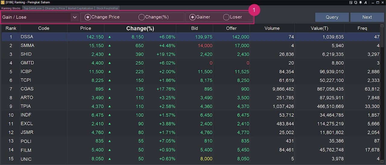 Merupakan layar yang menampilkan informasi daftar Rangking rangking saham secara real time, Rangking saham ini dikategorikan berdasarkan All, Top Gain/ Top Loss, Perubahan Harga, nilai Kapitalisasi Pasar serta Frequensi perdagangan.